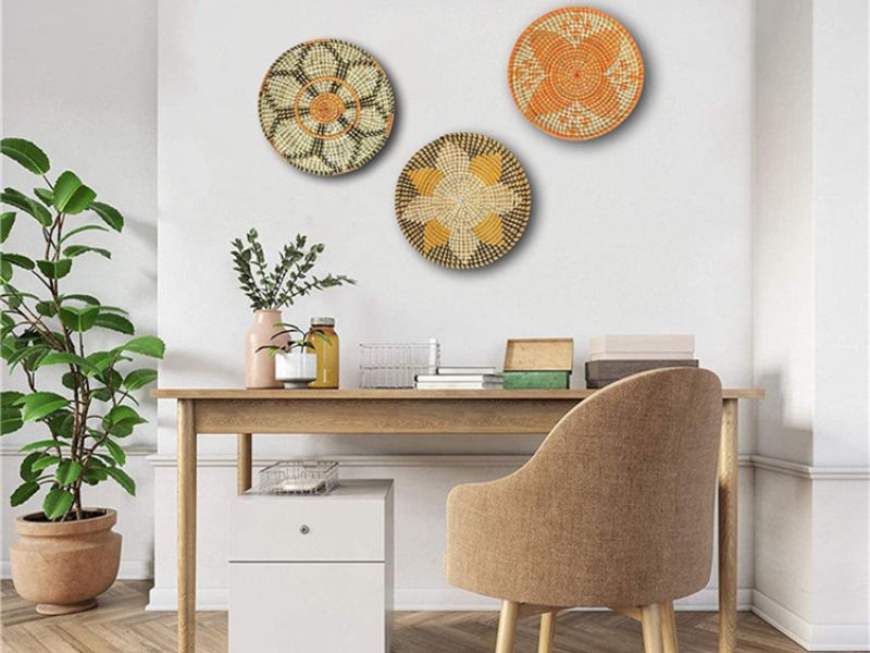 Intricate wall baskets with earthy tones create a boho-chic vibe. Handwoven from natural fibers, they add rustic charm, perfect for eclectic living rooms or cozy bedrooms.